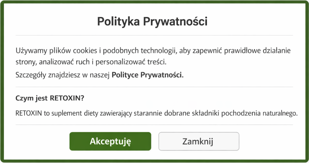 Przejmij kontrolę nad swoim samopoczuciem RETOXIN to suplement diety opracowany w celu wsparcia naturalnych procesów organizmu. Wspiera prawidłowe funkcjonowanie układu pokarmowego Pomaga w utrzymaniu naturalnej równowagi organizmu Wspomaga ogólną odporność Czym jest RETOXIN? RETOXIN to suplement diety zawierający starannie dobrane składniki pochodzenia naturalnego. Formuła została opracowana, aby wspierać naturalne procesy oczyszczania organizmu oraz prawidłowe funkcjonowanie przewodu pokarmowego. Preparat może być stosowany jako element zbilansowanej diety i zdrowego stylu życia. Co wyróżnia RETOXIN? BEZPIECZNA FORMUŁA Zawiera składniki pochodzenia naturalnego. WSPARCIE ORGANIZMU Pomaga wspierać odporność i równowagę organizmu. KOMPLEKSOWE DZIAŁANIE Wspiera prawidłowe funkcjonowanie układu pokarmowego. Jak stosować RETOXIN? 2 kapsułki dziennie Przyjmować zgodnie z zaleceniami producenta Spożywać podczas posiłku Suplement diety nie zastępuje zróżnicowanej diety i zdrowego stylu życia.